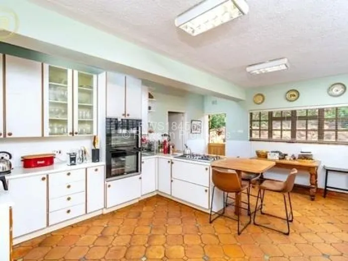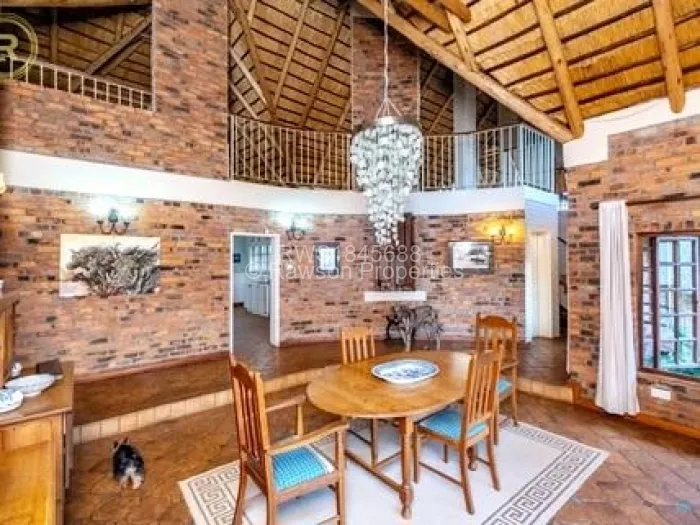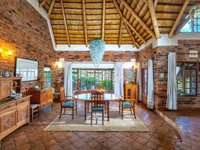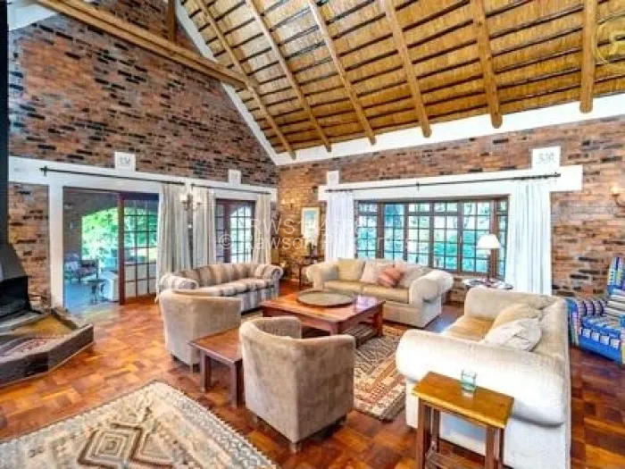 The developed 2 acres feature indigenous trees, immaculately manicured gardens, and a stunning architectural design. The spacious interior includes a main lounge with wooden floors, a charming mezzanine, and a modern kitchen.